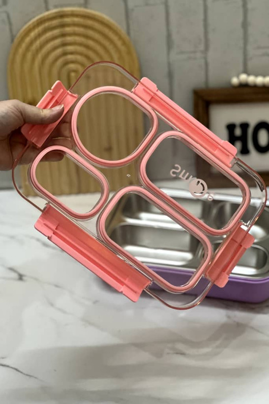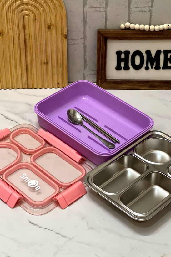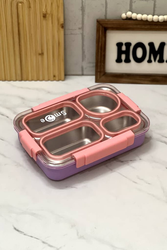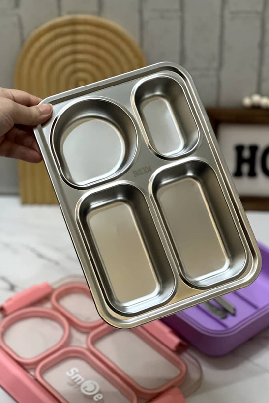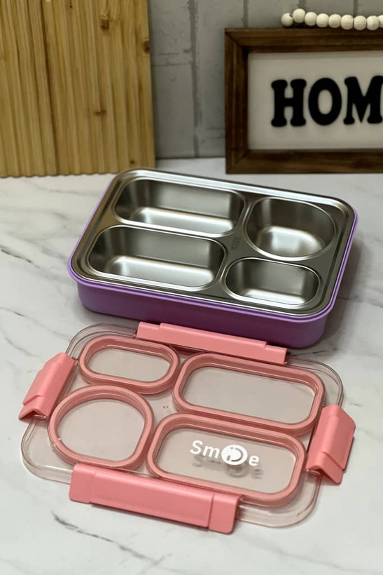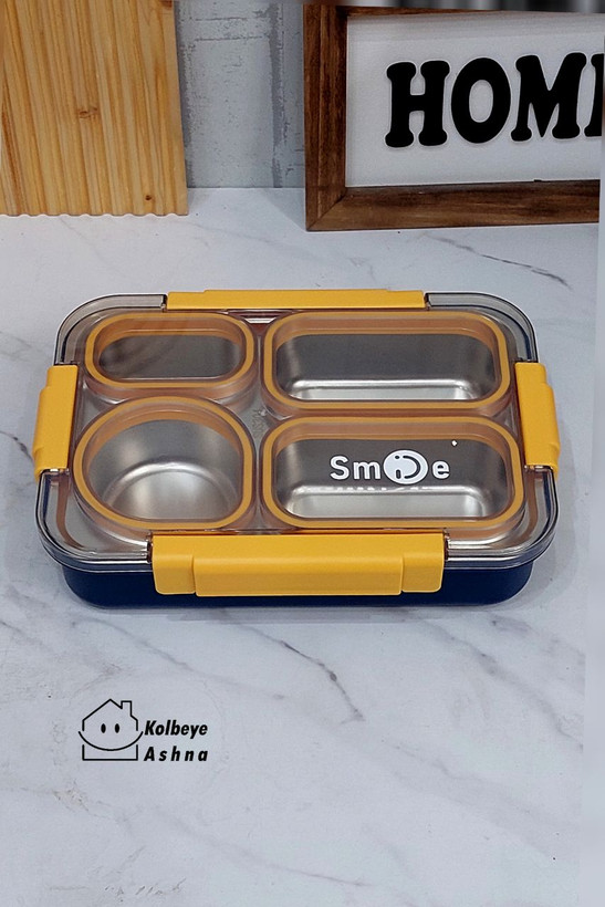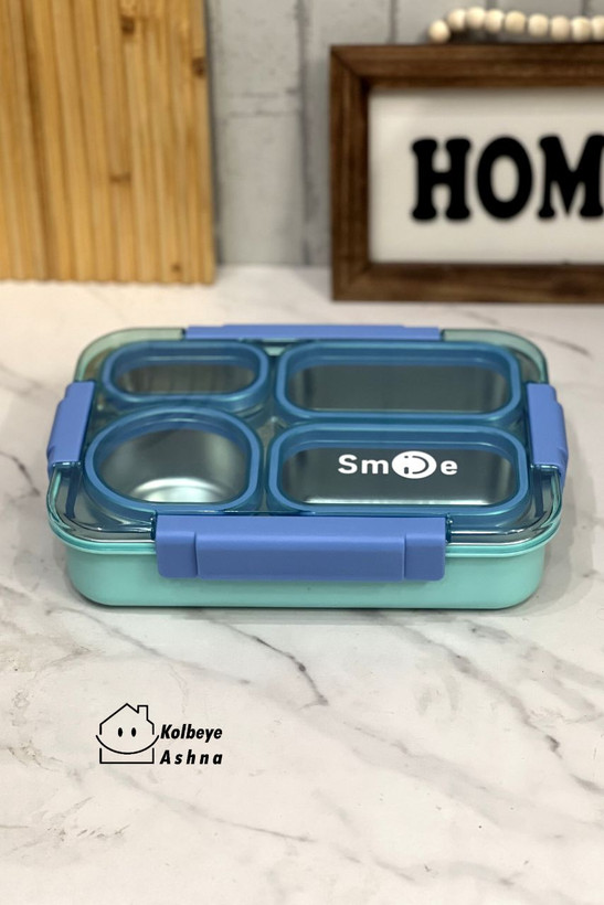 ظرف غذا لانچ باکس واشردار چهار قسمتی برند اسمایل قاشق و چاپستیک استیل
