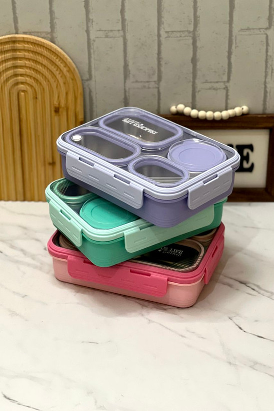 ظرف غذا لانچ باکس واشردار کاسه دار قاشق و چاپستیک استیل برند دلیشز